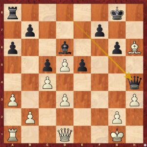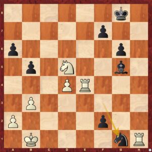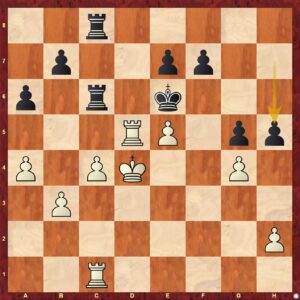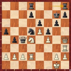 Zde však do hry vstoupila i časová tíseň. Jde o 37.tah, to už většinou na hodinách nezbývá příliš času ... Jediný nesprávný tah v dané pozici je 1. ... Vac8? Ten se v partii stal a černý byl za něj potrestán, jak si můžete ověřit v přehrávacím modulu. Správným tahem bylo buď 1....Va5! nebo dokonce 1. ... Vgc8!?, vždy s cca vyrovnanou pozicí, či spíše s nejasnou pozicí.
