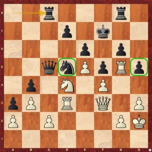 Proti hrozbě Dxh7+ má černý skutečně jen dvě (rozumné) možnosti. První možnost Vh8 už na první pohled působí pasivně. Šach je o figurkách, resp. o aktivitě figur a takto zpasivnit věž se nechce. Tah h7-h5 zase oslabuje královský kryt, slabinka se přesouvá z h7 na g6. Něco ale černý zahrát musí. Zde nevystačíme jen z obecnými frázemi, je třeba něco málo spočítat.