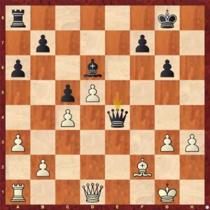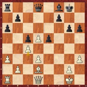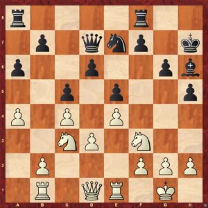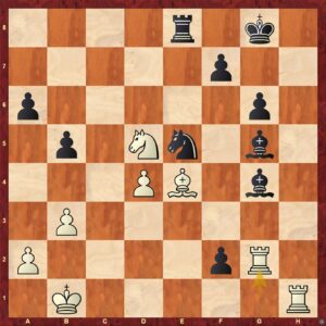 Pojďme nejdříve celou pozici zhodnotit. Bílý má více prostoru, o trochu lépe krytého krále, bílé figurky jsou aktivnější. Plusem černého je centrálně umístněný jezdec d5, který drží obranu a aktivní dáma, která by si (někdy) ráda smlsla na pěšcích bílého dámského křídla. Bílý stojí lépe, „informátorově“ bychom pozici ohodnotili jako +/_ (plus mínus pod sebou).