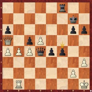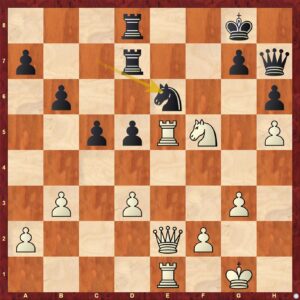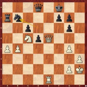 Zde také hodnocení pozice nevyvolává žádných nejasností. Bílý ovládá jediný volný sloupec, jezdec na f5 je strašná figura, černá dáma se krčí skromně na h7 ... Poslední tah Jc7-e6!? je už trošku zoufalá snaha nasypat do soukolí bílého útoku nějaký ten písek. Kupodivu to zabere ... Bílý stojí na výhru a měl by dokončit dílo.