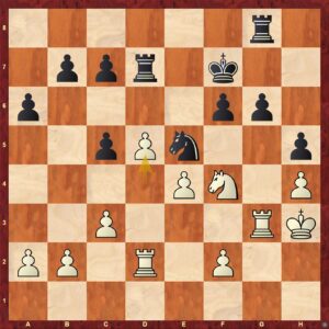 Vyrovnaný duel, napínavý do poslední vteřiny. Můj soupeř hrál po celou dobu skvěle, prakticky nic jsem nebyl schopen z pozice vyždímat. Až v počínající časové tísni se mi začalo zdát, že začínám stát pěkně. Mám v moci volný sloupec, aktivnější figurky, volného a pěšce. Jenže věc vůbec není jednoduchá. Zřejmě a jednoznačně jsem začal svoji pozici přeceňovat.