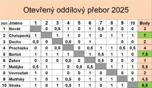 Jak jsem psal v minulém článku (nechávám text pod tabulkou!), tak mohla rozhodnout partie Bartoš – Straka. Ta dopadla vítězstvím černého, tedy klopýtnutím Lojzy. Jenže Vladimír Chalupecký svoji šanci nevyužil, prohrál poslední partii a tak se vítězem a oddílovým přeborníkem stává …