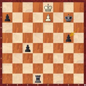 Na první desce tradičně nevíme, co si máme o pozici Davida myslet :-))) V partii FM Hák David- IM Doležal Radoslav se zprvu hraje v poklidném tempu, hra se po zahájení asi vyrovnala. Radek také nabízí remízu, což David samozřejmě nebere, protože ten je nebere nikdy :-))). Hra přechází do vyrovnané věžové koncovky, ve které David obětuje … tři pěšce ze čtyř! Nikdo neví jak to vlastně stojí … nakonec je z toho remíza, když partie končí efektně .. patem! Tuto koncovku si ukážeme, stojí určítě zato! Stav je ovšem z našeho pohledu nevylepšen … prohráváme 3 – 4.